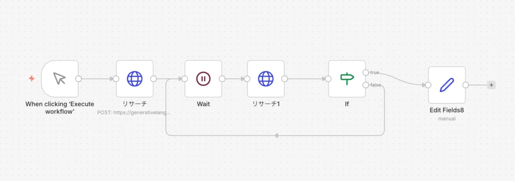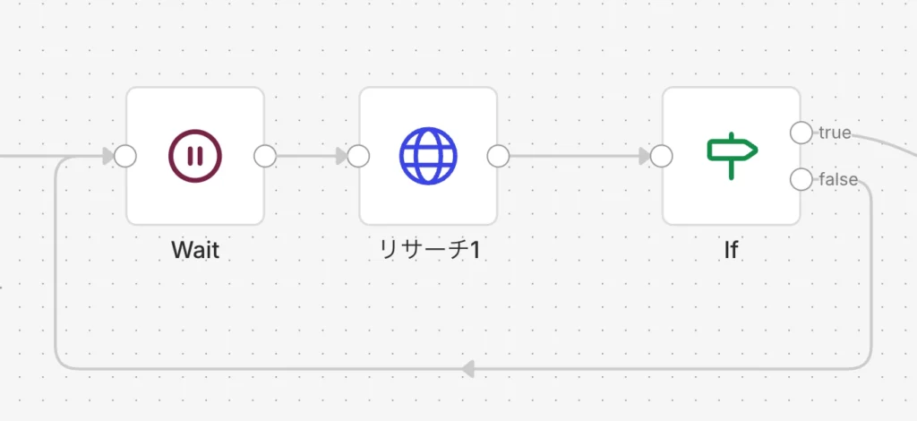 もし完了していれば、そのまま次のステップへ進んでレポートを受け取ります。でも、もしステータスがまだ「処理中」だった場合はどうすればいいでしょうか。ここでn8nの面白いところですが、処理中の場合は矢印を「Waitノード」に戻してあげるのです。こうすることで、「確認してまだなら待つ、また確認する…」というループ構造が出来上がります。AIが納得いくまで調査を続けられるよう、終わるまで根気強く待ってあげる仕組みを作るわけですね。