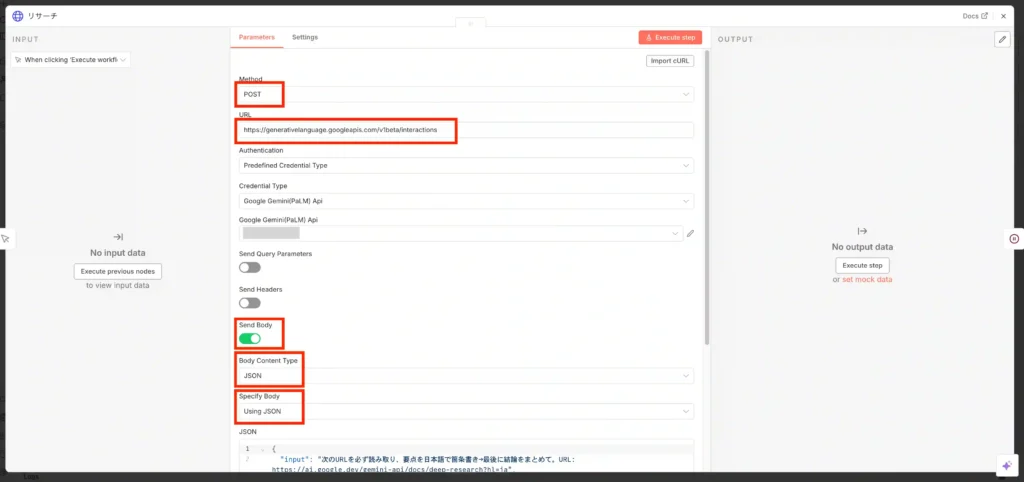 このノードで最も大切な設定は、送信するデータ(Body)の中身です。以下は例で「Gemini Deep Research エージェント」の要点をまとめてもらう指示をしています(この程度の調査でDeep Reasearchを使う意味はないかもれませんが…笑)。