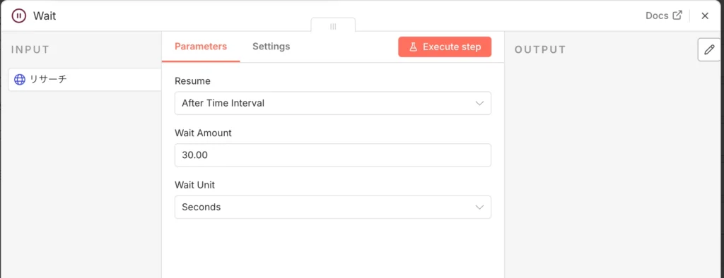 受付番号(Interaction ID)をもらったら、AIが調査を完了するまで少し待ってあげる必要があります。Deep Researchは非常に深い思考と検索を繰り返すため、すぐに「どう?」と聞いてもまだ準備ができていないことがほとんどです。そこでWaitノードの出番です。