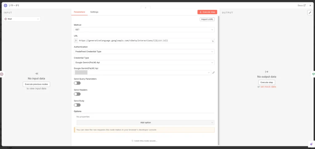 • URL:「https://generativelanguage.googleapis.com/v1beta/interactions/{{$json.id}}」をコピペ