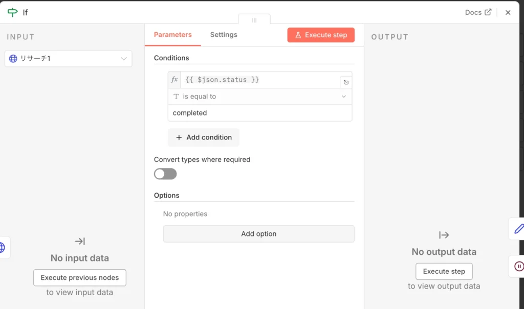 このノードでは、次の処理に進む前に一定時間待機する設定を行います。あまり頻繁に状況確認に行くと、Googleのサーバーに負荷をかけてしまい、一時的にアクセスを制限されてしまうことがあります。リサーチの内容にもよりますが、最初は30秒から60秒程度の間隔を空けてあげると安心です。焦らずゆっくり待つことで、エラーを回避しながらスムーズに処理を進められます。