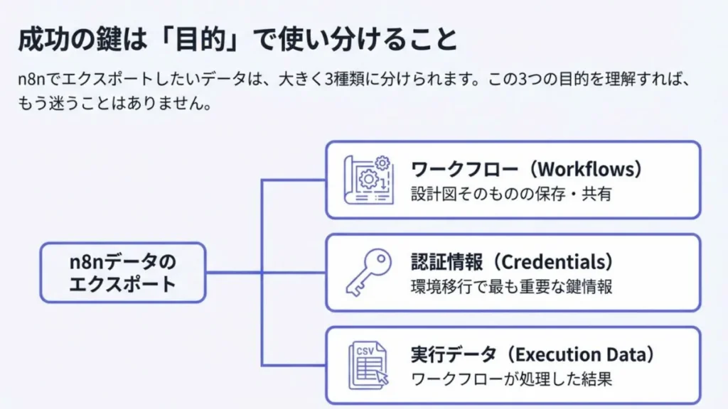 n8nのエクスポートは、保存したいデータの種類に合わせて正しい手順を選びさえすれば、誰でも安全にできるんです。