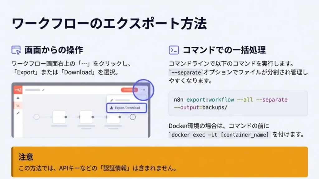 n8nのエクスポートと一言でいっても、実は何を保存したいかによって、やり方が全然違うんですよね。