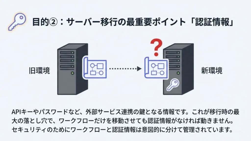 実は、APIキーやパスワードといった大切な鍵の情報は、ワークフローとは別に、特別な手順でお引越しさせてあげる必要があったんです。