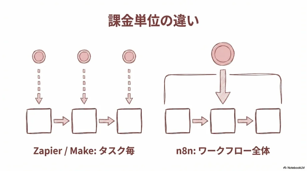 n8n Zapier Make ホスティング形態 セルフホスト可能(クラウド版もあり) クラウド専用 クラウド専用 課金単位 ワークフロー実行1回ごと ステップ(タスク)ごと オペレーション(処理)ごと コスト感 セルフホスト版は無料。クラウド版は月約3,300円〜 本格利用は月数百ドル以上になりやすい 無料枠あり、有料プランは月約1,000円〜 カスタマイズ性 高い(JavaScriptやPythonのコード挿入が可能) 低い(複雑な分岐・データ処理が苦手) 中程度 連携アプリ数 約1,900種類以上 8,000種類以上(業界最多) 1,000種類以上 使いやすさ(初心者) やや学習コストあり 最も直感的で始めやすい 中程度 n8nの最大の差別化ポイントは「課金モデル」と「セルフホスト可能」であること、そして「コードによる拡張」ができる点です。Zapierはワークフロー内のステップ数でカウントするため、複雑なフローを多く動かすほど費用が増えやすい構造です。一方n8nはワークフロー全体の実行1回をカウントするため、同じ処理量でも費用が予測しやすく、利用規模が大きくなるほどコスト優位が際立ちます。