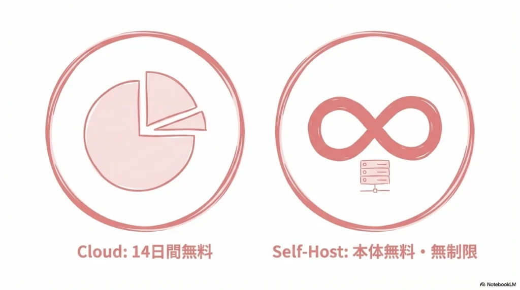 ・クラウド版は14日間無料で今すぐ始められ、セルフホスト版はDockerを使えばn8n本体を無料で使い続けられます。