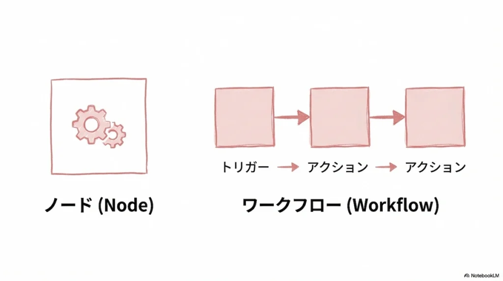 | ワークフロー | ノードを線でつないだ自動化の設計図全体 | 「受信→要約→通知→記録」という一連の流れ |
