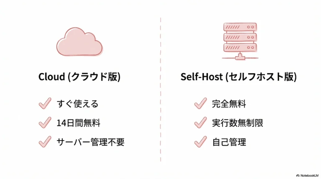 n8nには利用形態が2種類あります。どちらを選ぶかは、スキルレベルや用途によって異なります。
