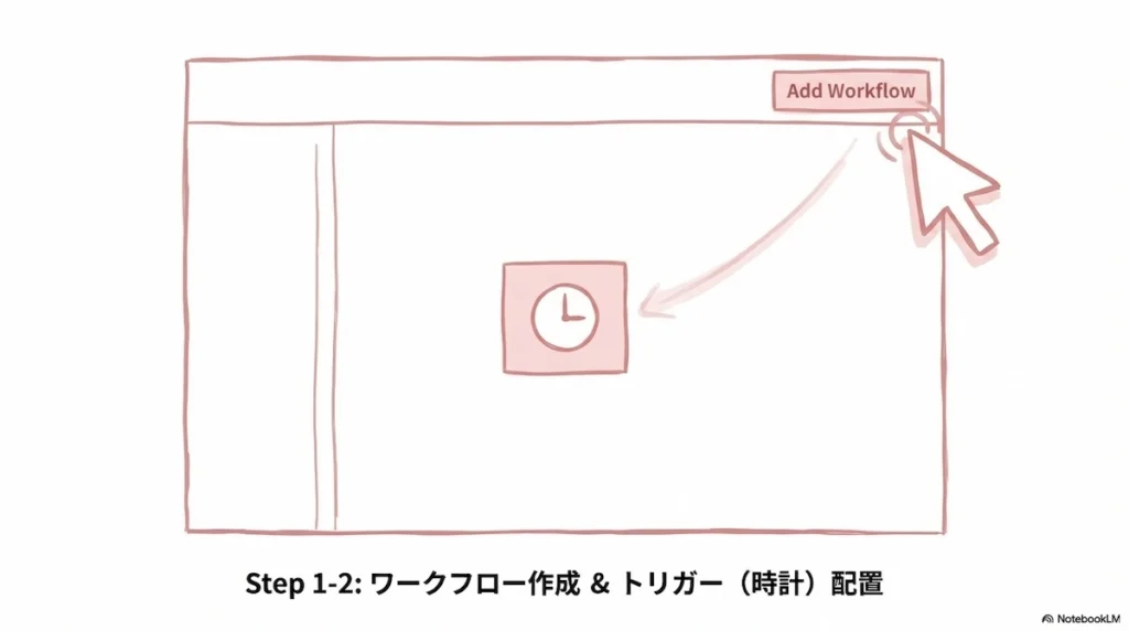 すべてのワークフローは「トリガー(きっかけ)」から始まります。今回は「毎日決まった時刻になったら自動で動き出す」という設定をします。