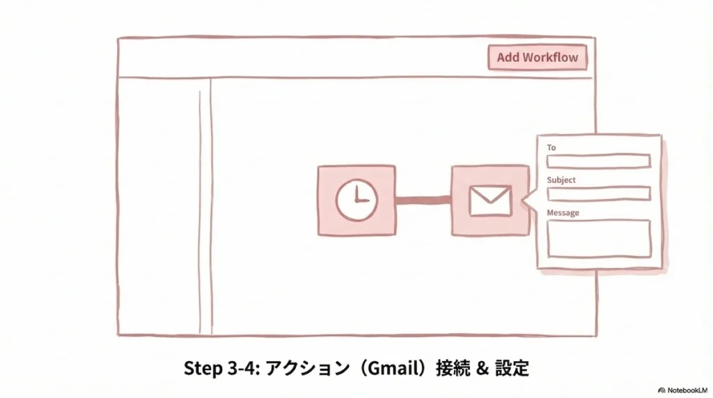 トリガーの後に「何をするか」を定義するアクションノードを追加します。今回はGmailでメールを送信します。