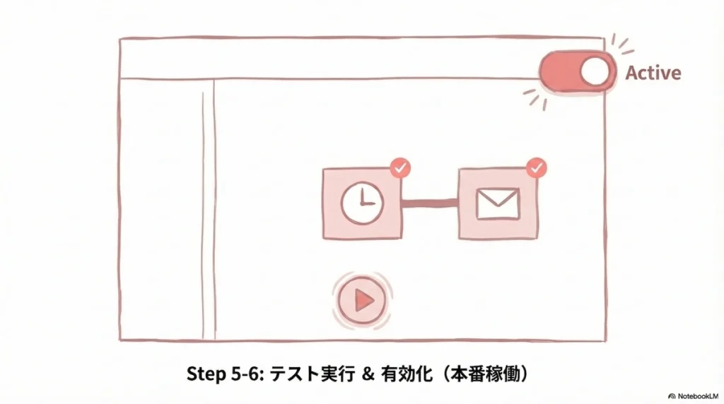 ワークフローを本番稼働させる前に、正しく動くかをテストします。n8nではトリガーの時刻を待たずに手動でテスト実行できます。