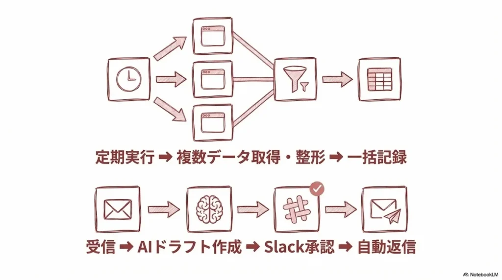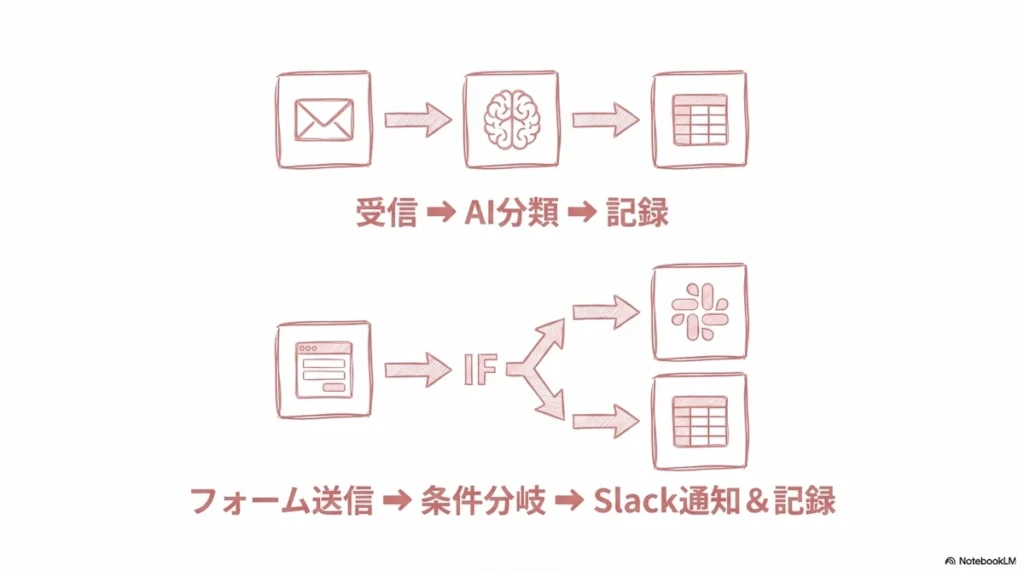 基本操作を覚えたら、次は実務に直結するワークフローを組んでみましょう。ここでは「すぐに使える」をテーマに、業務でよく発生する4つの自動化パターンをフロー図とともに紹介します。