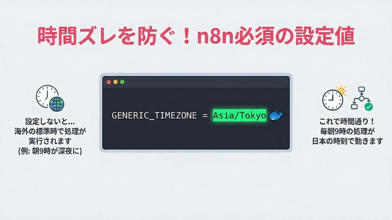 もう1つは、ご自身でn8nを設置して使っている方向けの、日本の時間に合わせて正しく動かすための大切な設定になります。