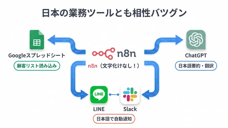 それに、もっと大事なポイントがあって、n8nは日本語のデータを扱うのがとっても得意なんです。